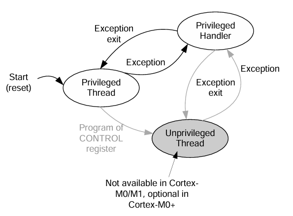 | Privileged | Full access to all instructions, system control space, and memory regions | Thread & Handler |