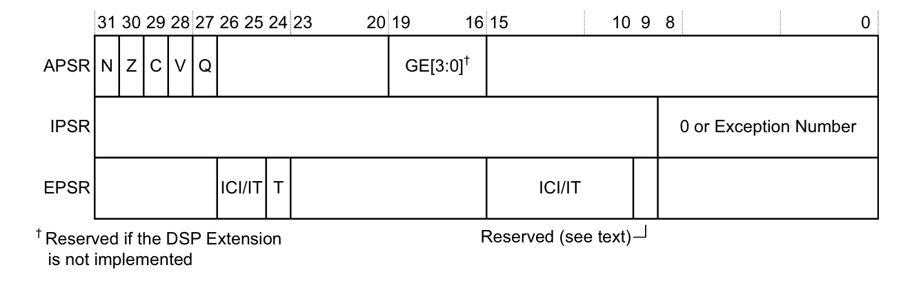 The x Program Status Register (PSR) is a 32-bit register that comprises three subsections: