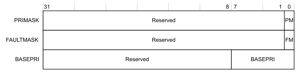 1-bit register that masks (disables) all exceptions except for Non-Maskable Interrupt (NMI) and HardFault.
