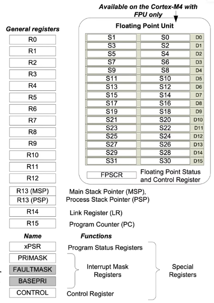 The ARM Cortex-M architecture have much simpler registers than its x86 counterpart. The architecture describes 4 categories of registers based on their purpose in the system. Those are as follows: